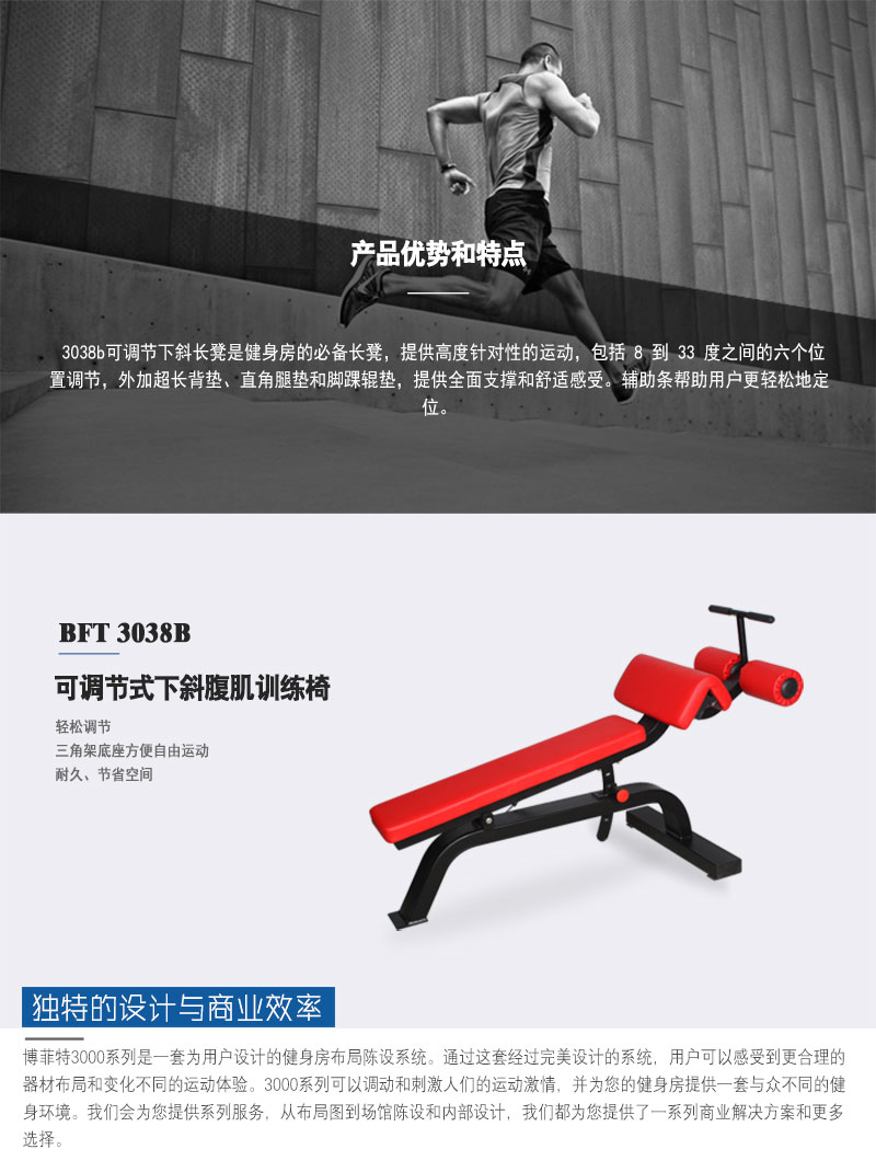 可調節腹肌板,健身房多功能可調節腹肌訓練器,廣州博菲特健身器材有限公司,商用健身器械生產廠家。8 到 33 度之間的六個位置調節,外加超長背墊、直角腿墊和腳踝輥墊,提供全面支撐和舒適感受